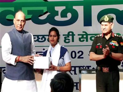 Defence Minister Rajnath Singh felicitates sanitation workers as part of 'Swacchata hi Sewa' campaign; plants sapling at Army Headquarters