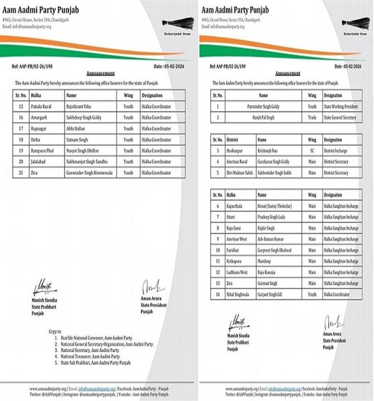 At the district level, Krishanjit Rao has been made SC Wing District Incharge for Hoshiarpur, while Gursharan Singh Goldy has been appointed District Secretary for Amritsar Rural and Sukhwinder Singh Sukhi as District Secretary for Shri Muktsar Sahib. Further strengthening the organisation in key constituencies, the party has appointed Halka Sangathan Incharges. Henat (Sunny Thekedar) for Kapurthala, Pradeep Singh Lada for Attari, Rajbir Singh for Raja Sansi, Adv. Raman Kumar for Amritsar West, Gurpreet Singh Dhaliwal for Faridkot, Mandeep for Kotkapura, Raju Kanojia for Ludhiana West, and Gurman Singh for Zira as Halka Sanghtan In-charge.