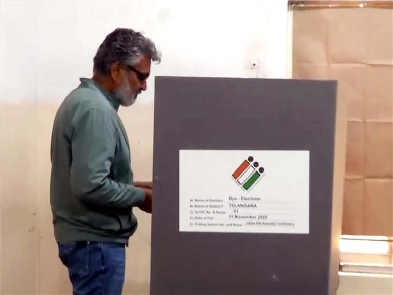 Hyderabad : 'Baahubali' director SS Rajamouli cast his vote for Jubilee Hills Assembly by-election in TelanganaWhile exercising his constitutional right, ace director SS Rajamouli, along with his son SS Karthikeya, cast his vote at a polling station in Sheikpet for the Jubilee Hills by-elections on Tuesday.He went to the polling station in casual wear, which included a green jacket and denim pants.