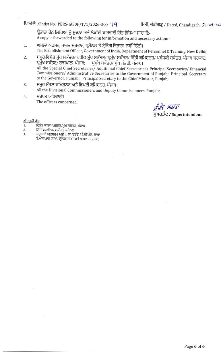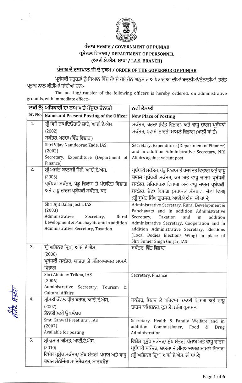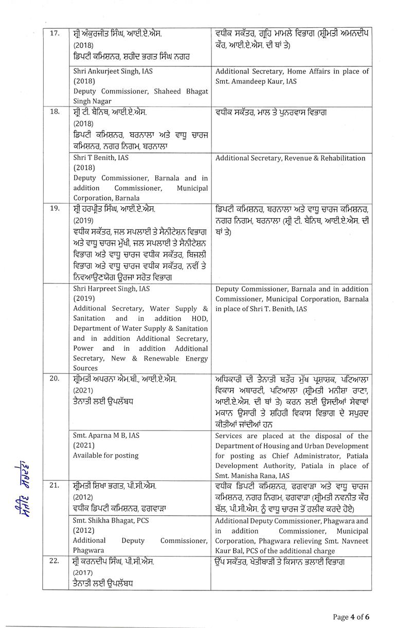 Chandigarh: The Punjab government has transferred 26 IAS and PCS officers with immediate effect. The reshuffle includes the Deputy Commissioners of Patiala, Ropar, and Nawanshahr.