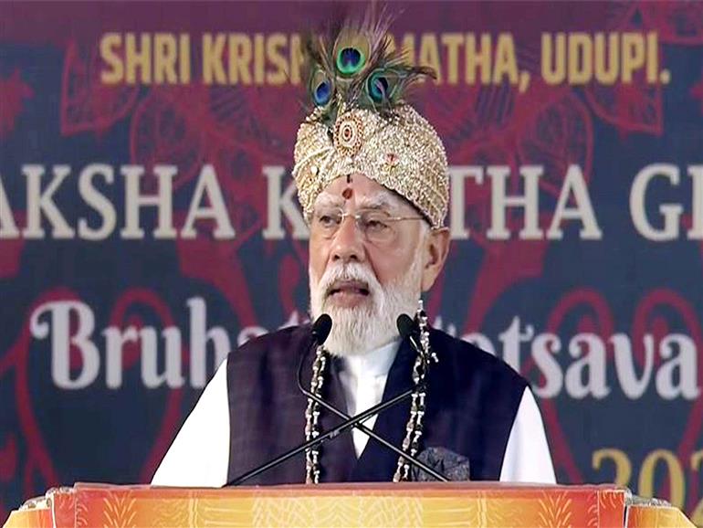Addressing the gathering in Udupi, the Prime Minister said, "Lord Krishna delivered the sermons of the Gita on a battlefield. Bhagwat Gita teaches us that it is important to end the oppressor to restore peace and truth. This is the essence of the National Security policy. We believe in 'Vasudhaiva Kutumbakam' (world is one family) and we also recite the mantra of 'Dharmo Rakshati Rakshitah' (Dharma protects the protector)."
