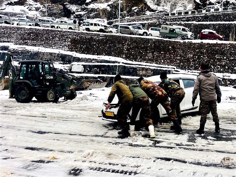 Gangtok : Approximately 350 tourist vehicles are stranded near Tsangu between Sipsu and 16th mile along the Jawaharlal Nehru (JN) Road under Sherethang CP/PS jurisdiction following heavy snowfall reported around 11:30 am on Sunday.