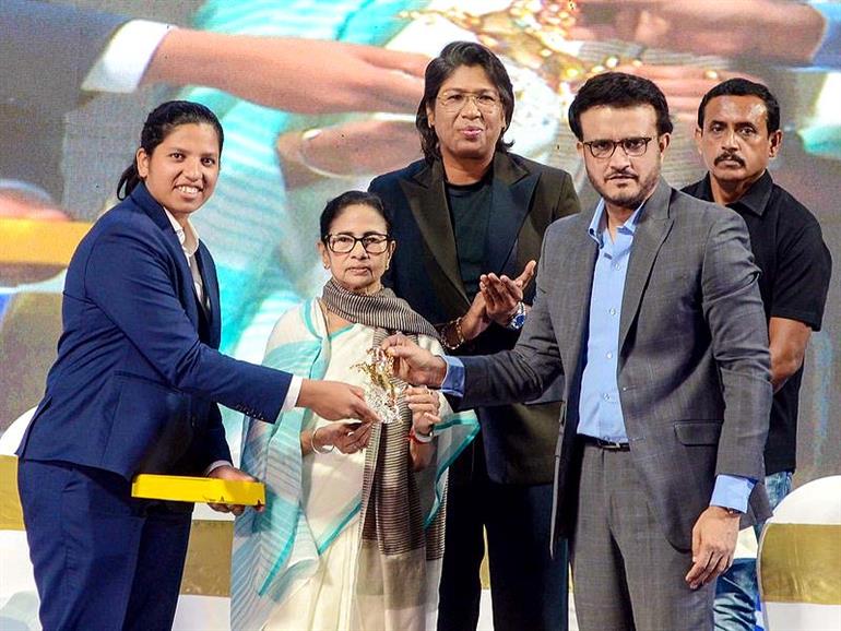 During her felicitation ceremony, Ghosh was presented with a bouquet, a memento and a cheque worth Rs. 34 lakh from the CAB. The Chief Minister also handed over to her a golden bat and a golden ball on behalf of the Cricket Association of Bengal (CAB).