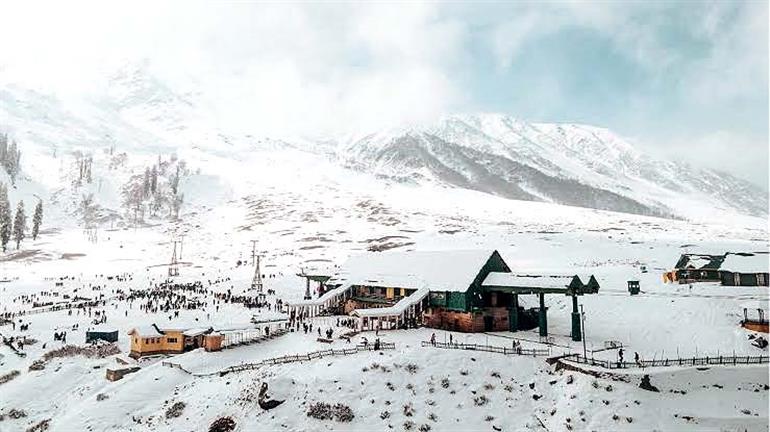 Bhaderwah : A large number of tourists thronged Guldanda meadow in Bhaderwah to experience the heavy snowfall on Tuesday. Bhaderwah has transformed into a winter wonderland, with snowfall charming tourists from Delhi and Haryana who visit this place due to its natural beauty.