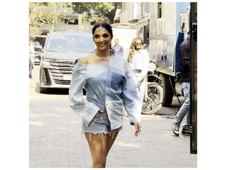 The 'Shershaah' star was dressed in denim shorts paired with a light-coloured off shoulder shirt and striking shoes. She kept her makeup minimal and her hair tied in a ponytail.