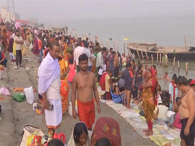 Patna : Devotees began the festive celebrations of Chhath Puja with puja rituals and a sacred dip in the Ganga at Patliputra Ghat in Patna on the first day, known as 'Nahaye Khaye.'