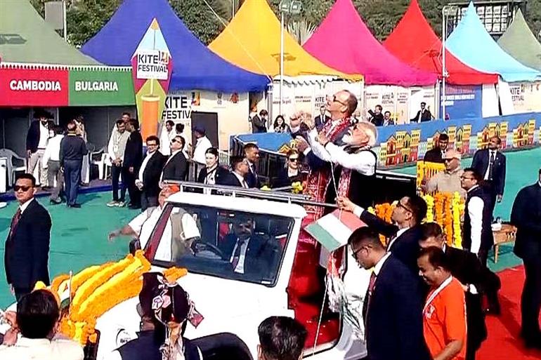 Ahmedabad : Prime Minister Narendra Modi and German Chancellor Friedrich Merz on Monday participated in the International Kite Festival 2026 at the Sabarmati Riverfront, where the leaders were seen flying a kite depicting Lord Hanuman.
