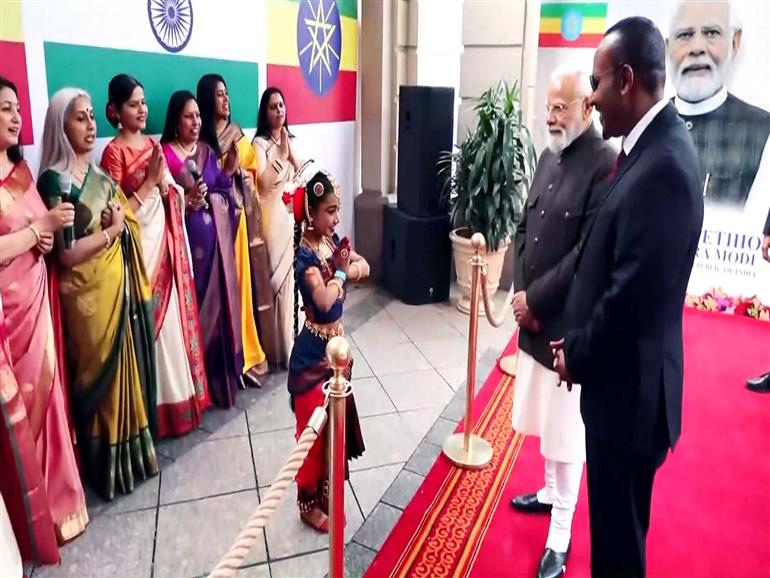 Addis Ababa : Prime Minister Narendra Modi was accorded a warm reception by members of the Indian community after reaching his hotel in Addis Ababa, with Ethiopian Prime Minister Abiy Ahmed Ali accompanying him from the airport.