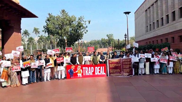 New Delhi : Opposition MPs on Thursday staged a protest against the India-US interim trade deal at the Makar Dwar of Parliament in the national capital. Opposing the trade deal between India and the US, opposition MPs called it a "trap deal" and held placards. The opposition also protested in favour of the Bharat Bandh called by trade unions to oppose various central policies.